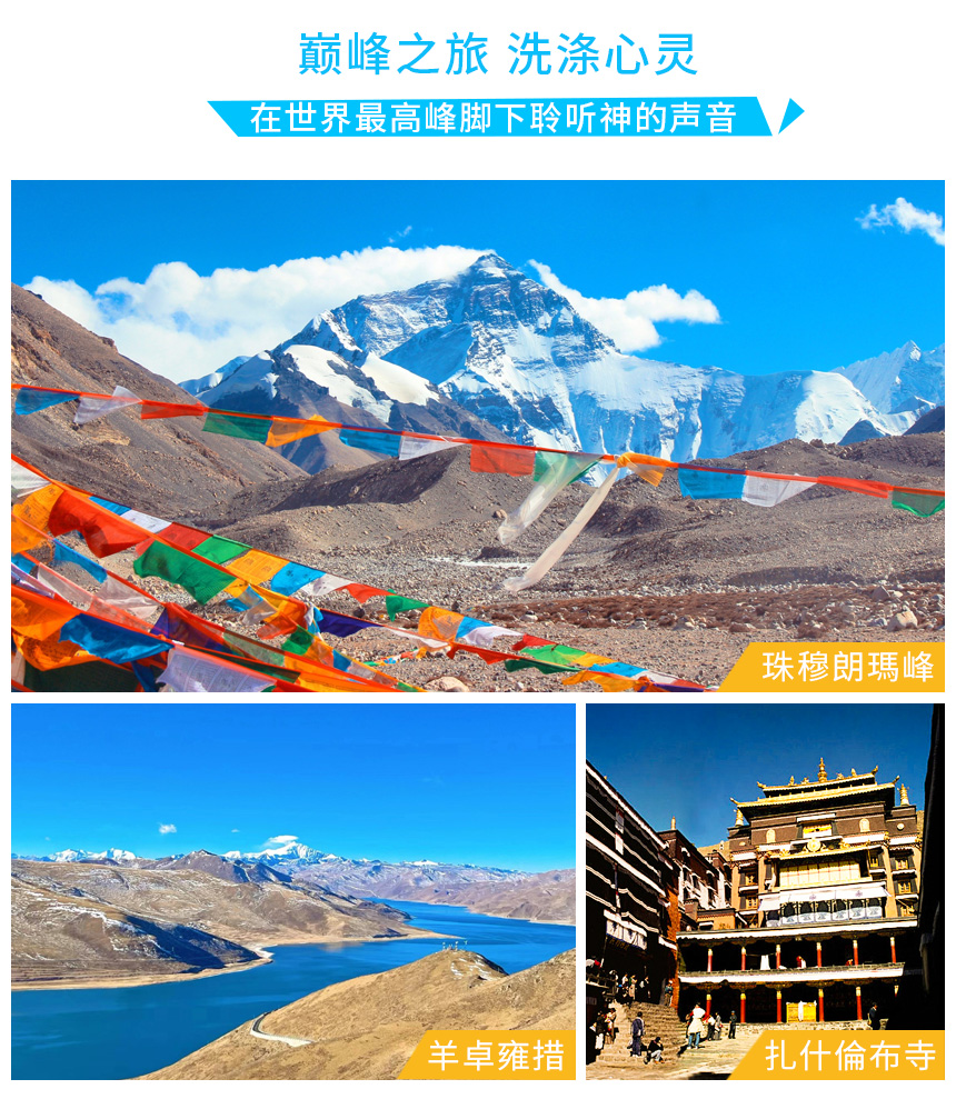 「雪山之巅,梵音入耳——穿越西藏,触摸灵魂的净土,挑战世界第一高峰,今年您准备来了吗?本线路中外游客均可定制包团游。」