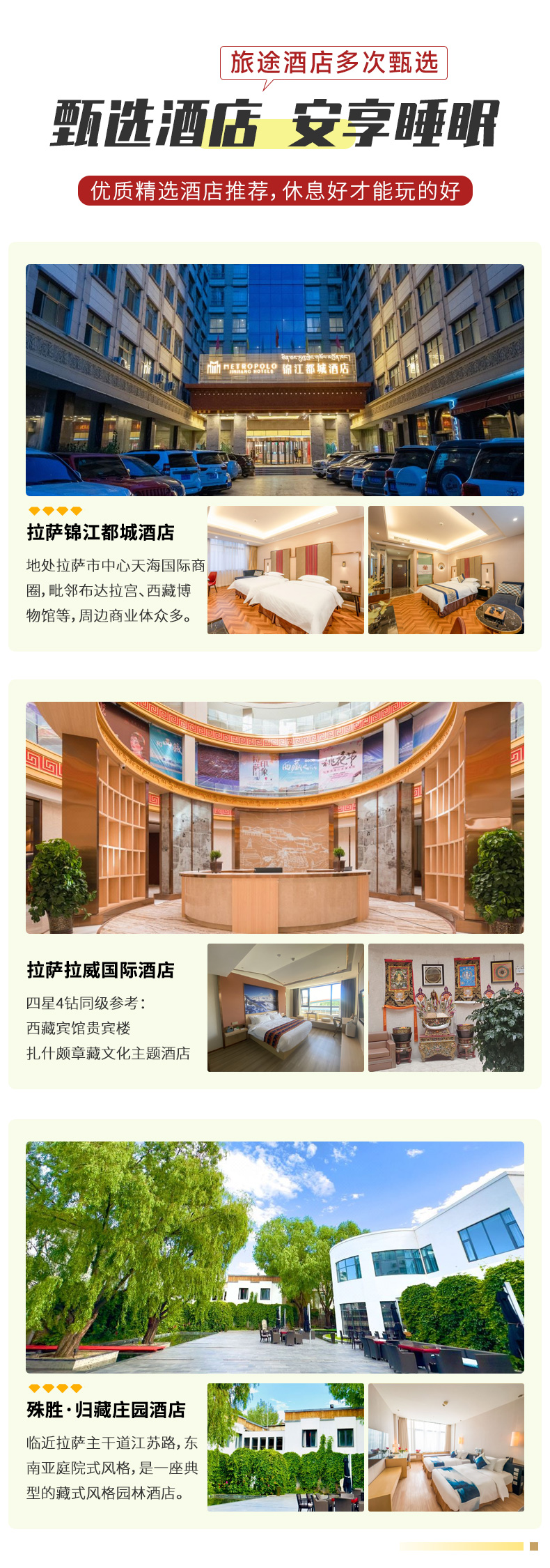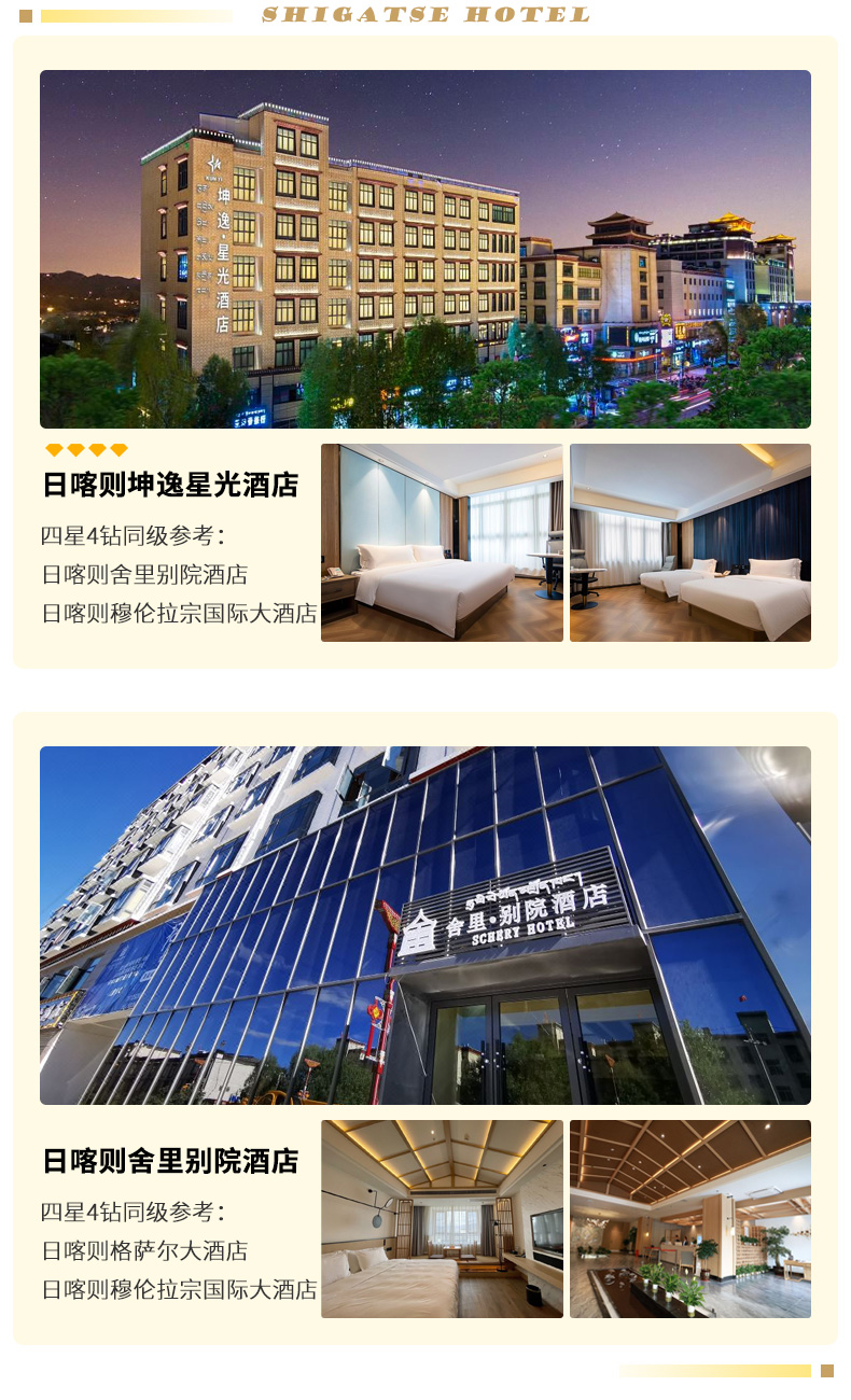 酒店安排:城市地区为携程4钻/4星舒适型酒店,乡镇地区为当地精品酒店或民宿(可住外宾,港澳台同胞);(珠峰帐篷旅馆为多人间通铺床位无独卫)。如需升级酒店,欢迎您联系我们。