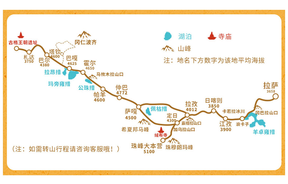 | 第3天 | 萨嘎-冈仁波齐-玛旁雍错-塔尔钦 589km | × | × | × | 自理 |