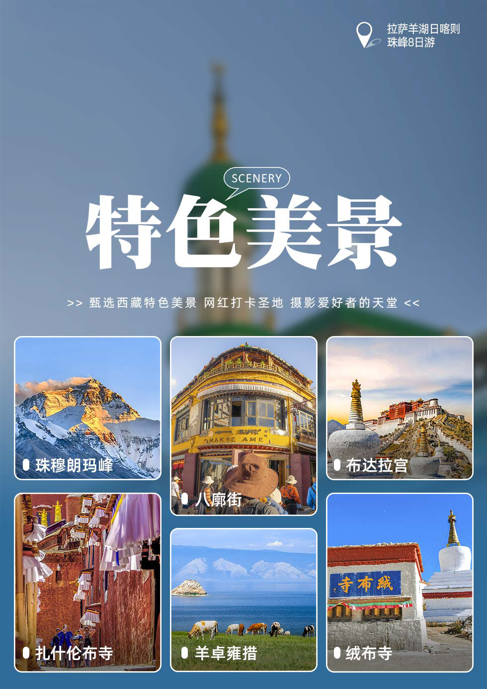 「涵盖了拉萨市内热门景点的参观,前往珠峰、羊湖等经典景点观光,真正的深入西藏,感受高原风光。」